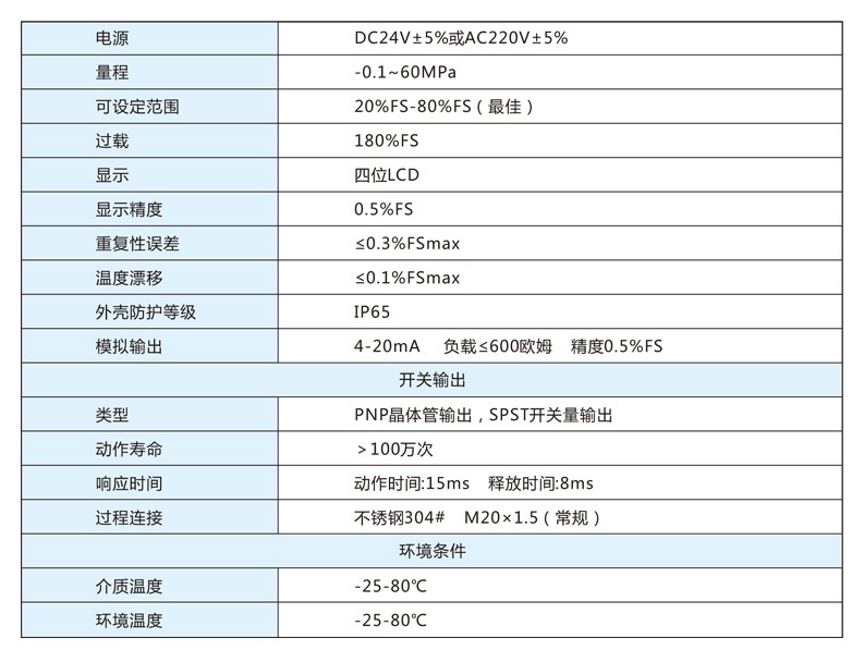 精度高,重復(fù)性好,壽命長,無膜片,無觸點(diǎn),耐腐蝕性強(qiáng),設(shè)定靈活方便,顯示直觀,溫漂小